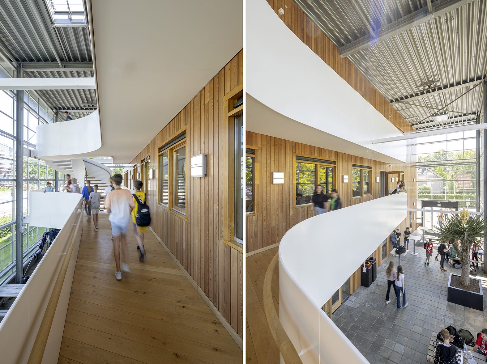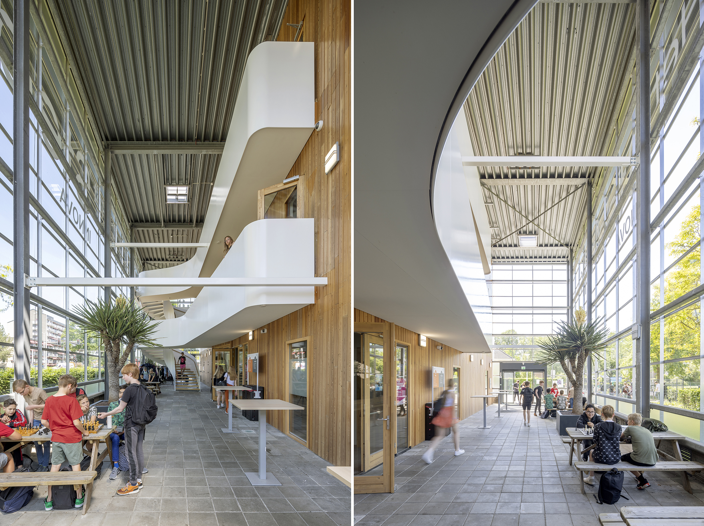 Een bijzondere school als deze vraagt om een bijzondere binnenkomst. Daarom transformeerden we de kale glazen hal naar een verwelkomende driedubbelhoge entree met een wenteltrap als blikvanger. De wenteltrap contrasteert met de bestaande lariks panelen en zorgt, samen met de nieuwe receptie, voor een duidelijke overgang tussen binnen en buiten. Daarnaast zorgt de trap er ook voor dat leerlingen als vanzelf binnenkomen op de eerste verdieping, waar schoolbrede ontmoetingsruimtes te vinden zijn; zo fungeert de wenteltrap dus ook als een ‘wegwijzer’ naar het hart van de school.