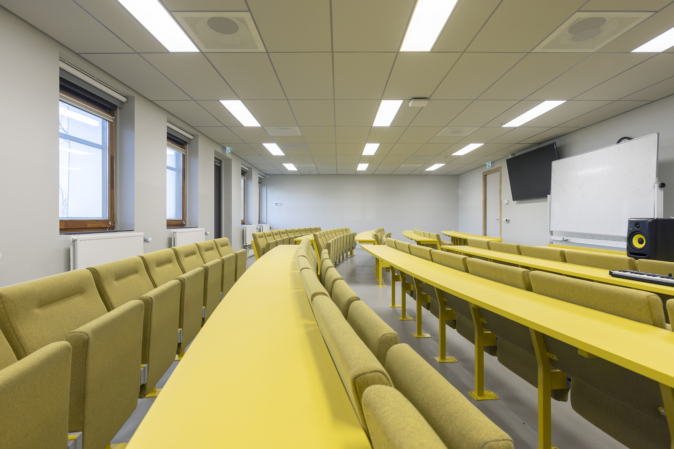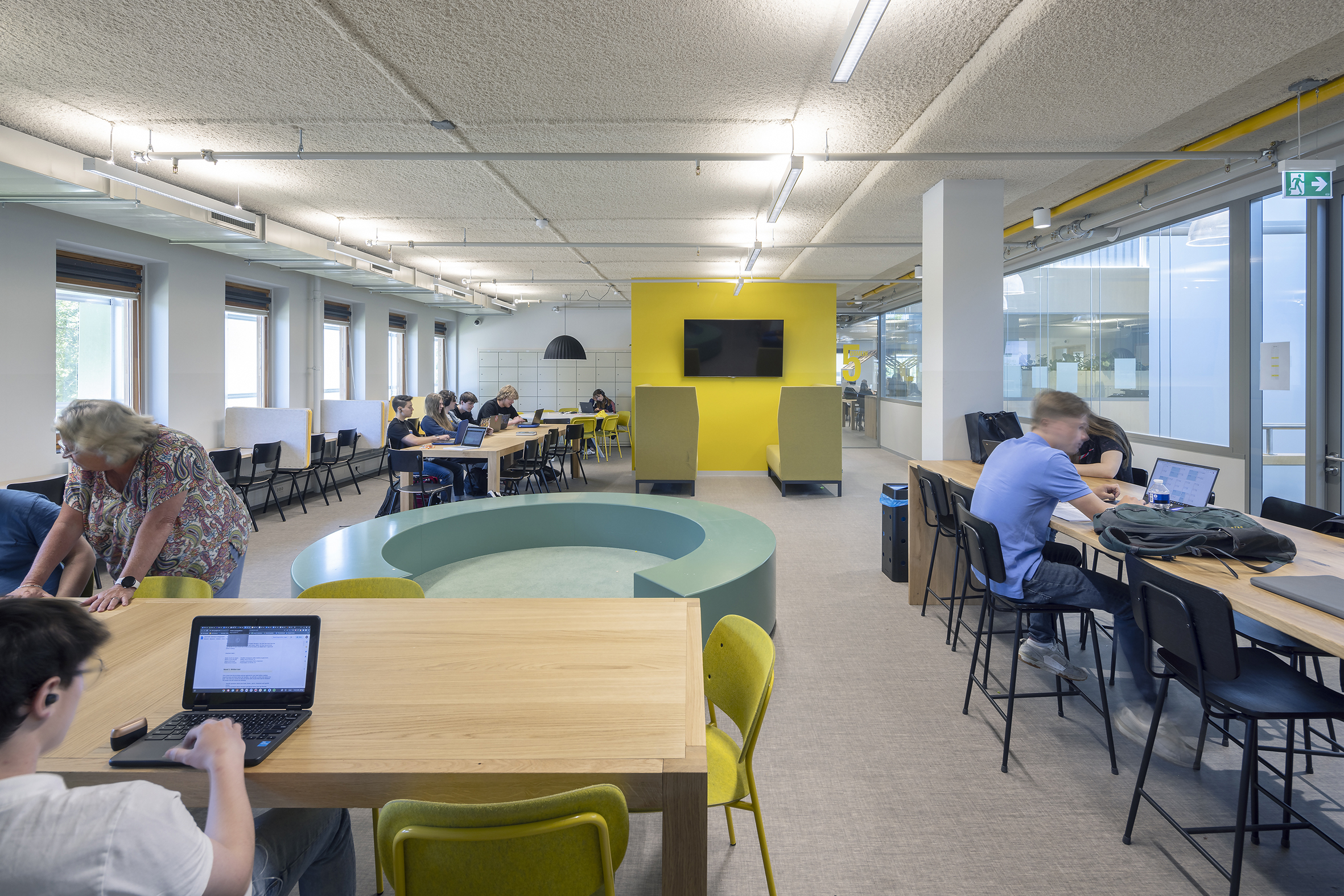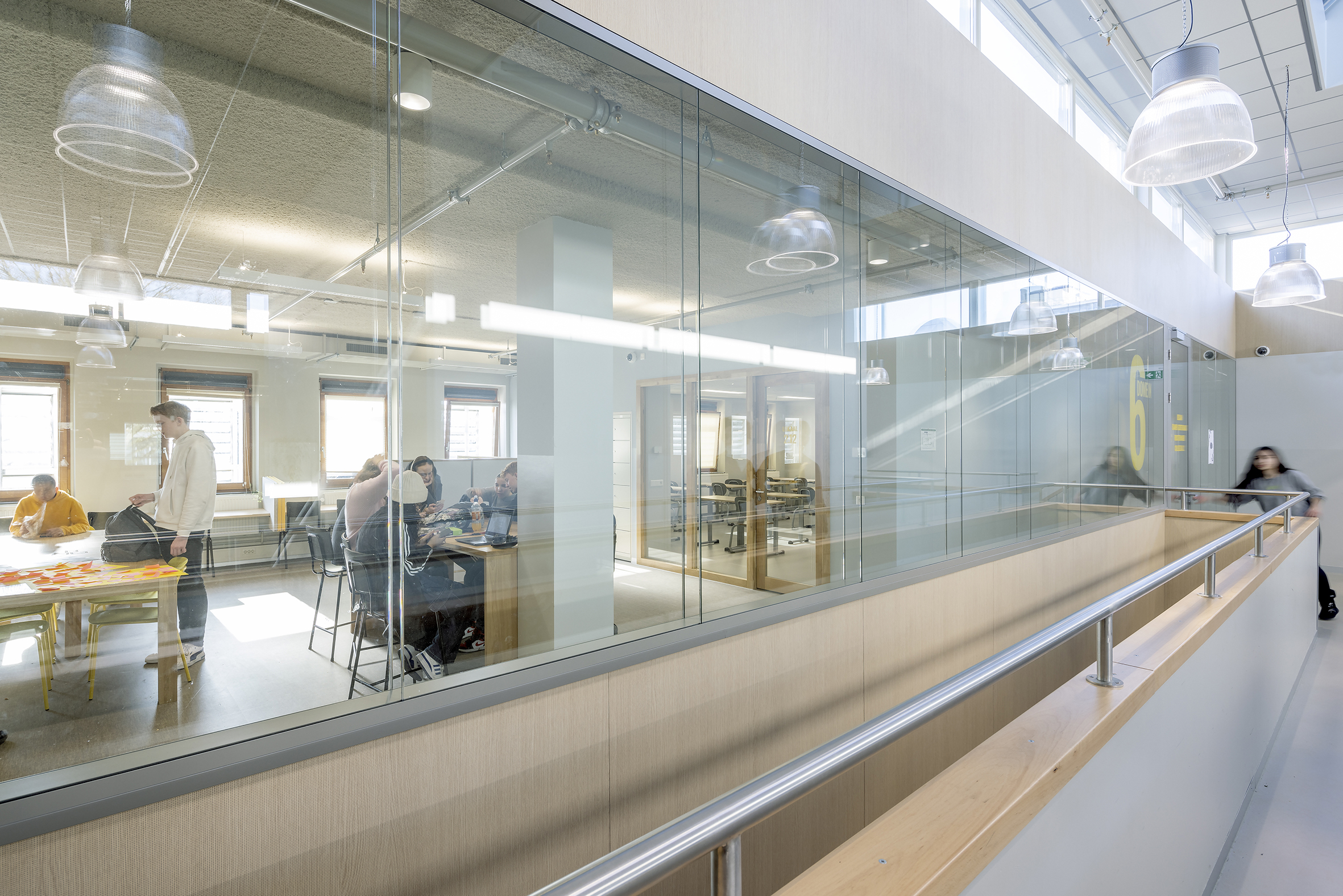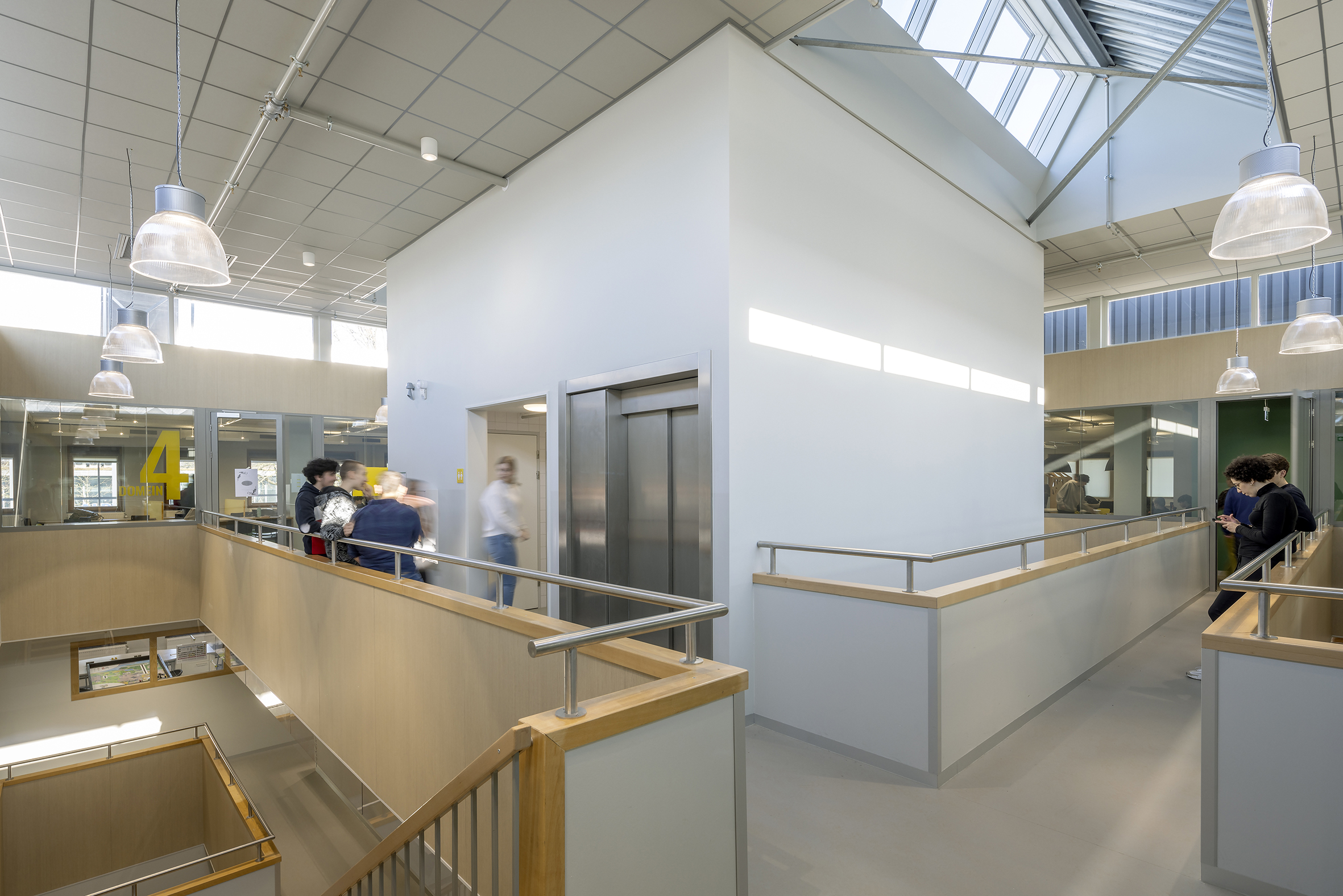 Na de verbouwing heeft het gebouw nu een open en transparante indeling. Door extra openingen in de vloeren - in aanvulling op de bestaande dakkoepel - valt het daglicht diep naar binnen; om dit te versterken hebben we in het midden van het gebouw een vide gecreëerd, die ook dienst doet als ‘ruggengraat’. Tussenwanden zijn zoveel mogelijk uitgevoerd in glas. Om een gevoel van hoogte te houden werden er in de leerdomeinen geen verlaagde plafonds toegepast, maar zijn de installaties juist licht gehouden en in het zicht gelaten.