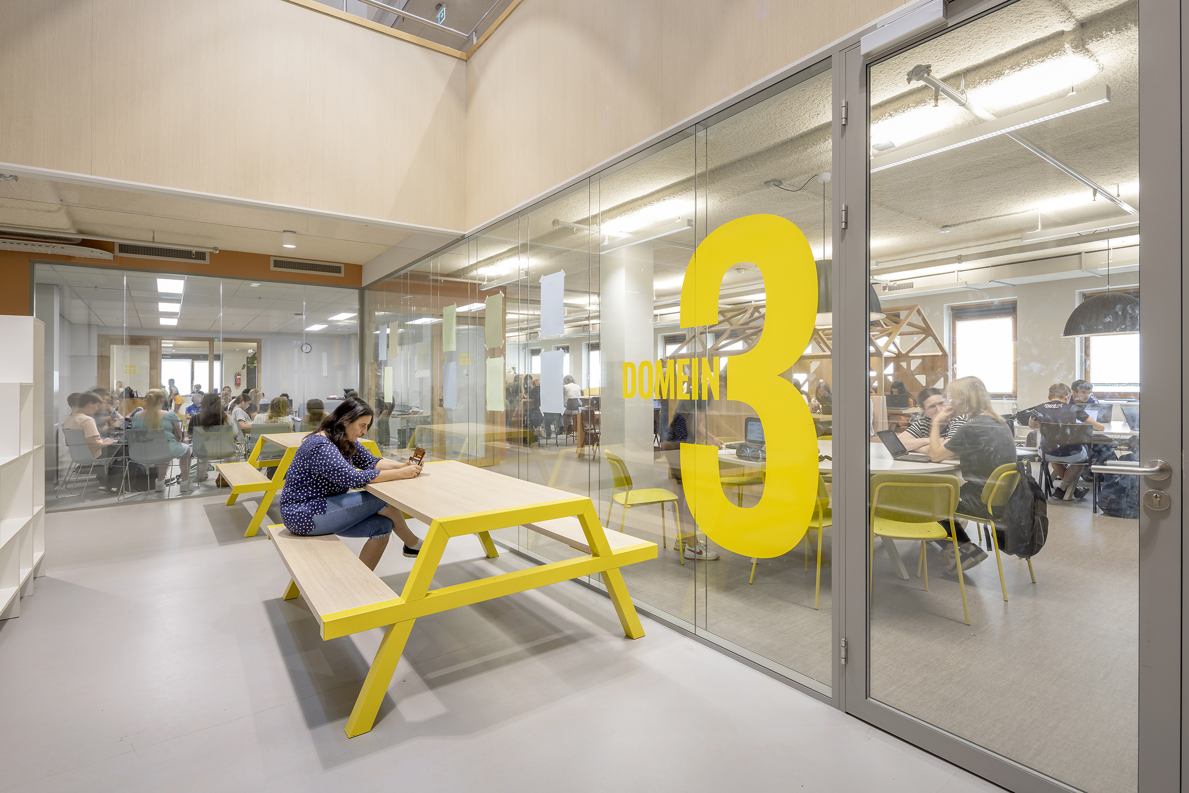 Op de eerste verdieping bevinden zich grote ontmoetingsruimtes die onder andere gebruikt worden als kantine, maar ook practicumlokalen voor bijvoorbeeld Natuurkunde, Biologie en Scheikunde. Daarnaast is er plek ingeruimd voor speciaal onderwijs. De begane grond en de tweede verdieping bieden ruimte aan de leerdomeinen van respectievelijk de onder- en de bovenbouw, met drie leerdomeinen per verdieping, en daaraan gekoppeld ondersteunende ruimtes voor lessen. De opzet van de verschillende leerdomeinen sluit aan bij de verschillende onderwijstypes en bij de leeftijd van de leerlingen.